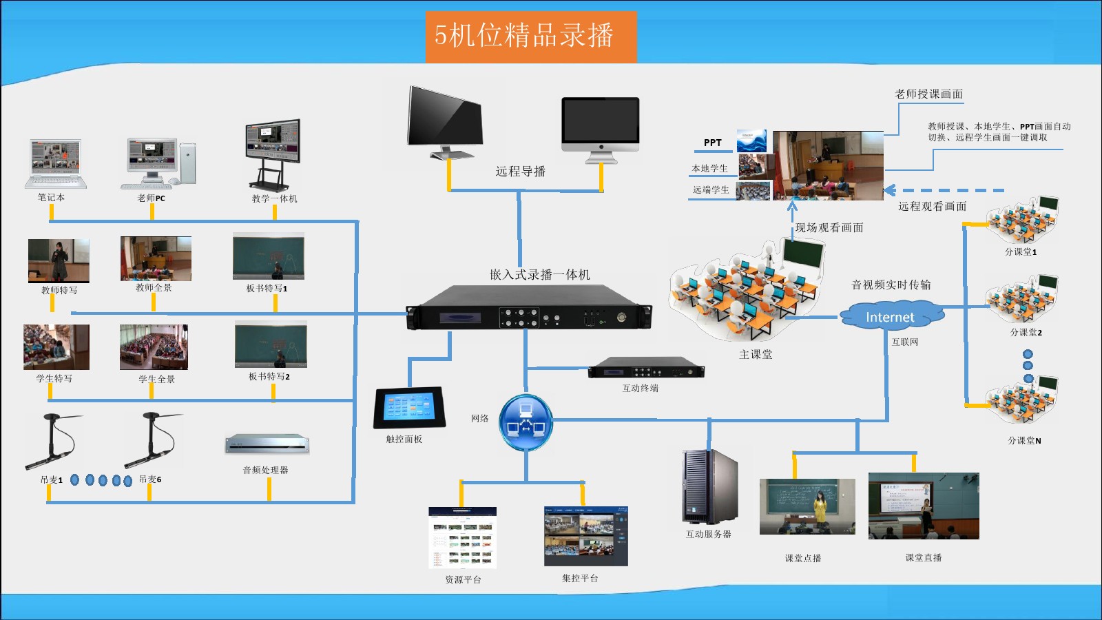 設備支持遠程音視頻高清實時交互,基于網(wǎng)絡云服務,無需專線,與錄播系統(tǒng)無縫結合;特有的遠程互動課堂模式專為教學打造。